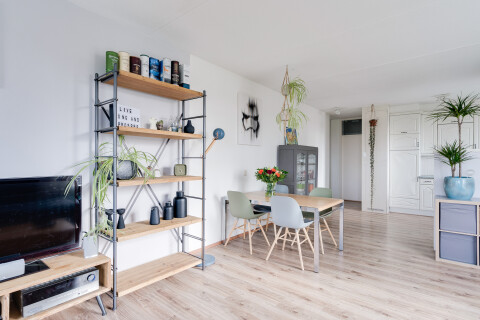 De super lichte woonkamer is voorzien van een laminaatvloer en heeft een deur naar het balkon, welke gunstig op de zon ligt. De grote open hoekkeuken is modern en voorzien van alle inbouwapparatuur. Het appartement heeft in zijn geheel isolerende beglazing met praktische ventilatieroosters, waardoor u ook kunt ventileren als u niet thuis bent! Op de begane grond vindt u een eigen berging voorzien van verlichting en stopcontacten.